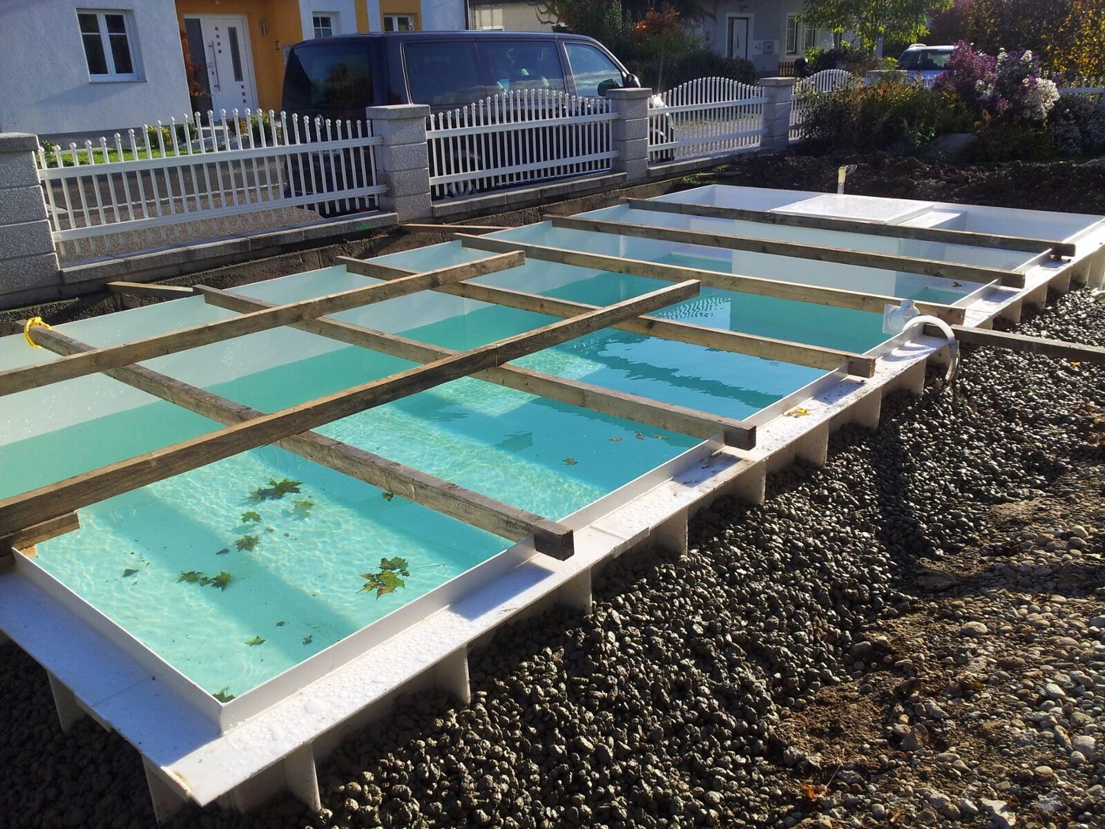Die Fundamentplatte wird in der Regel aus Stahlbeton ausgeführt. Die Stärke richtet sich nach der Bodenbeschaffenheit sowie der Größe des Pools. Bitte orientieren Sie sich auch hier an den entsprechenden Angaben in unseren Plänen.