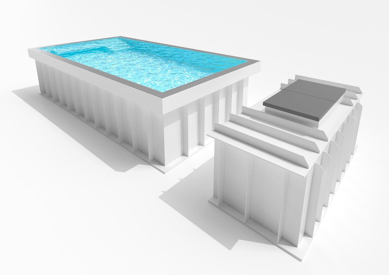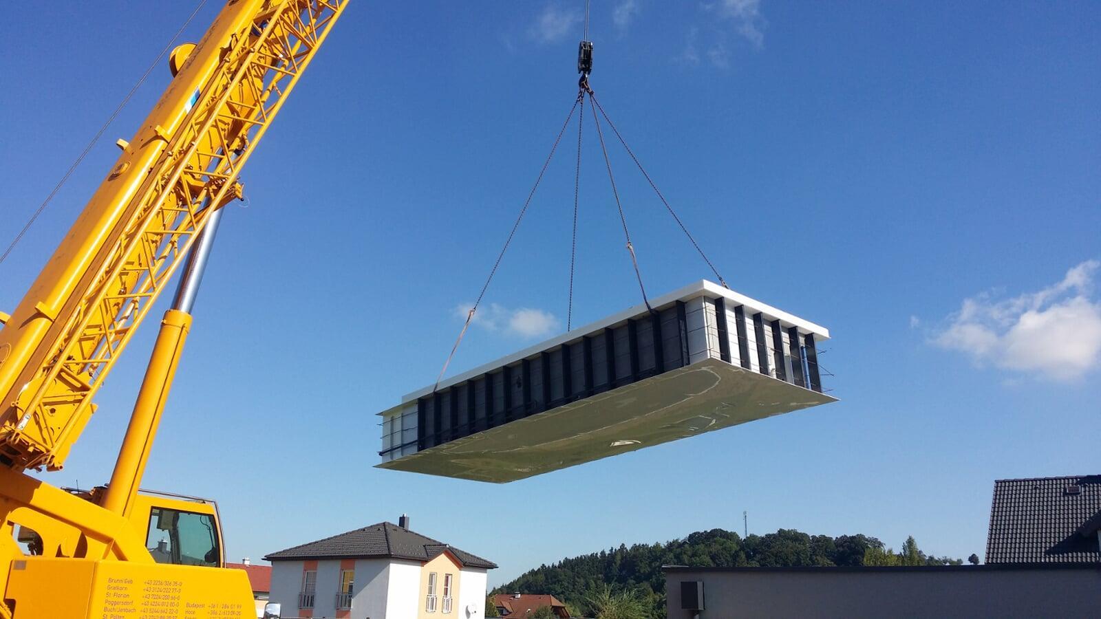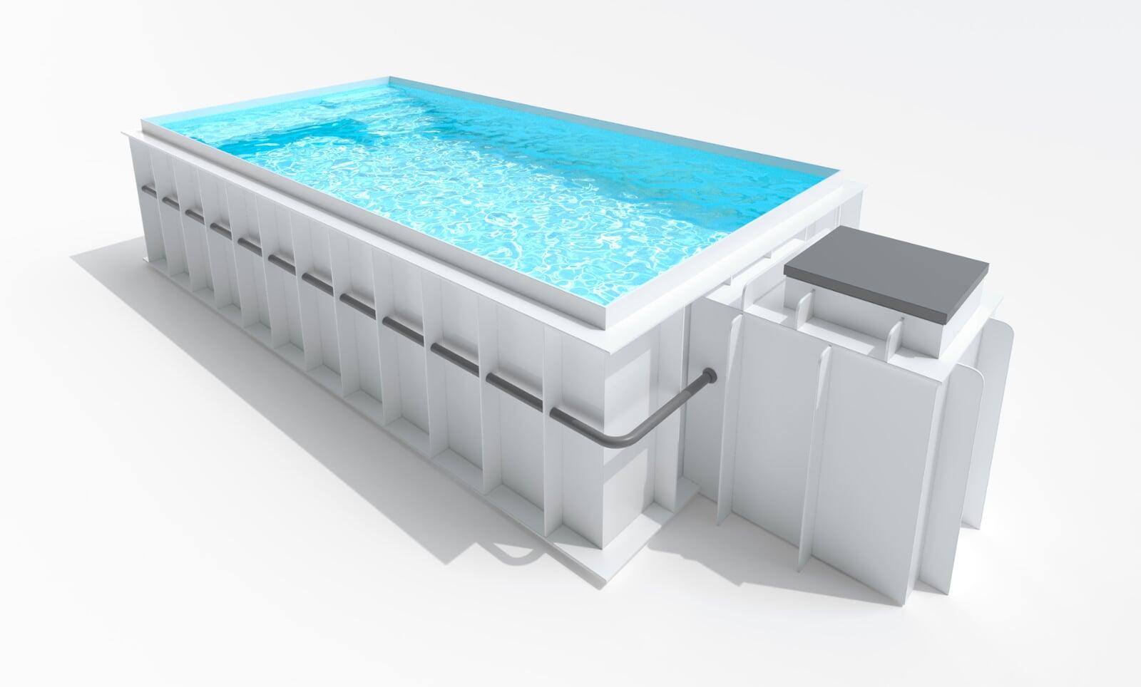 Das Poolbecken wird fertig isoliert und verrohrt, inklusive aller Einbauteile, zur Baustelle geliefert. Anschließend wird es mittels Kran – der nicht im Lieferumfang enthalten ist – in die vorbereitete Baugrube eingehoben. Der Hub dauert in der Regel etwa 20 Minuten.