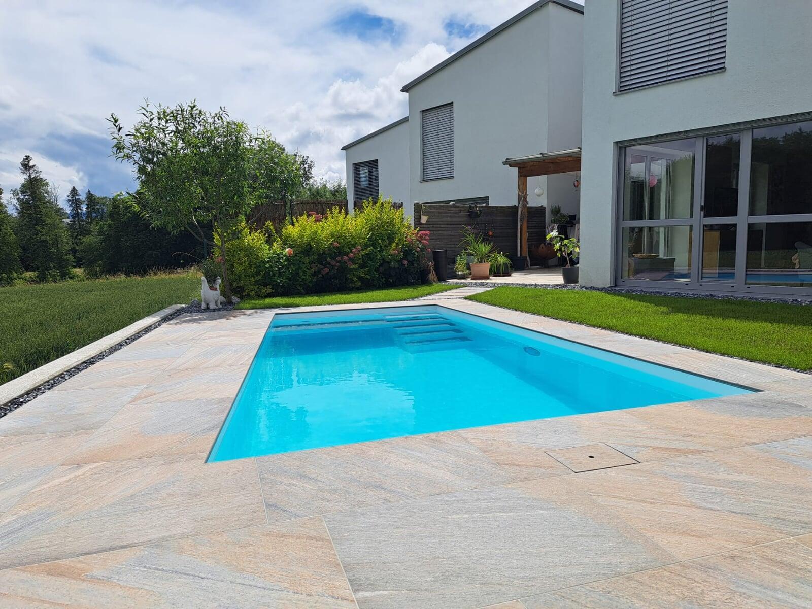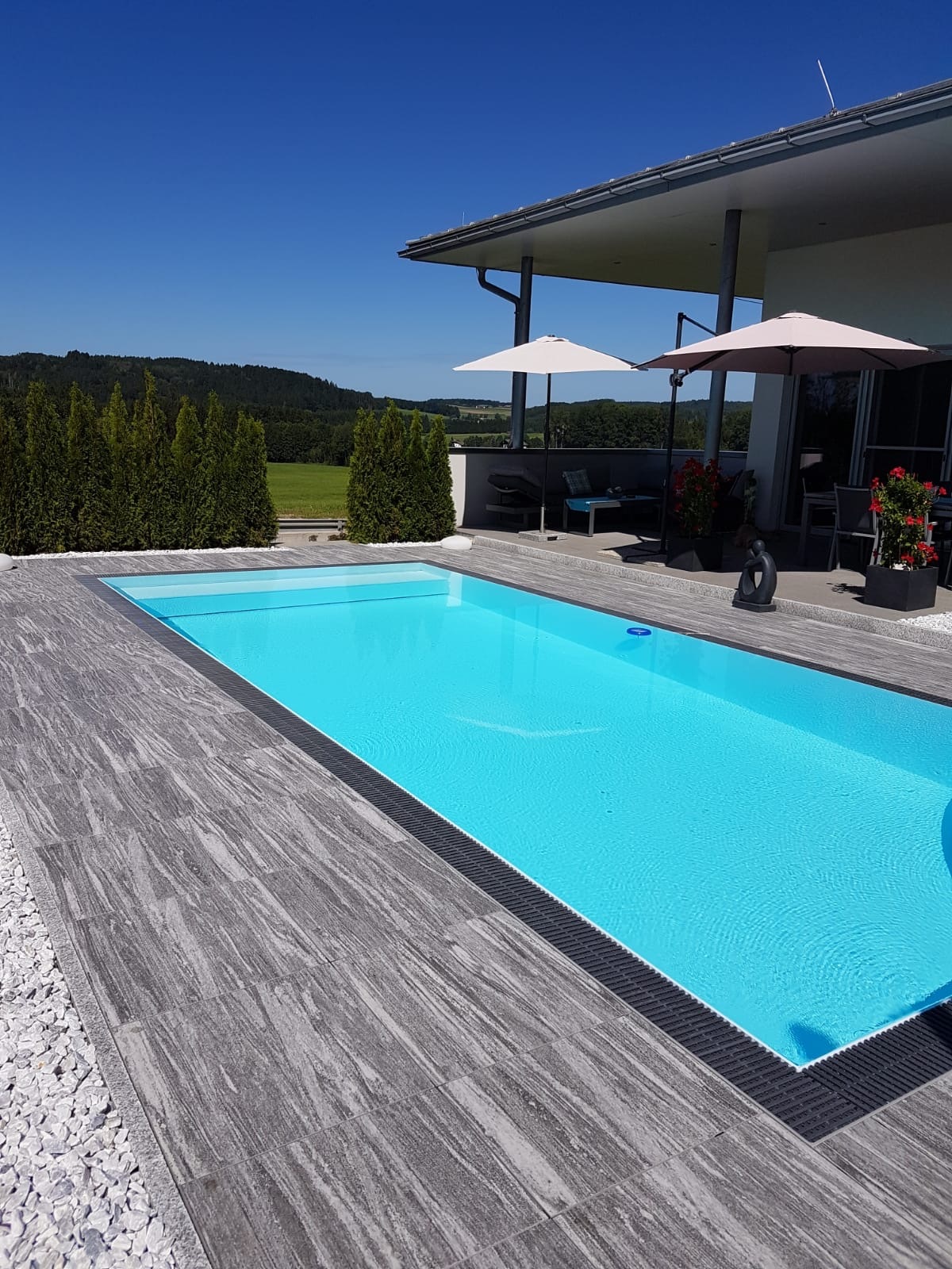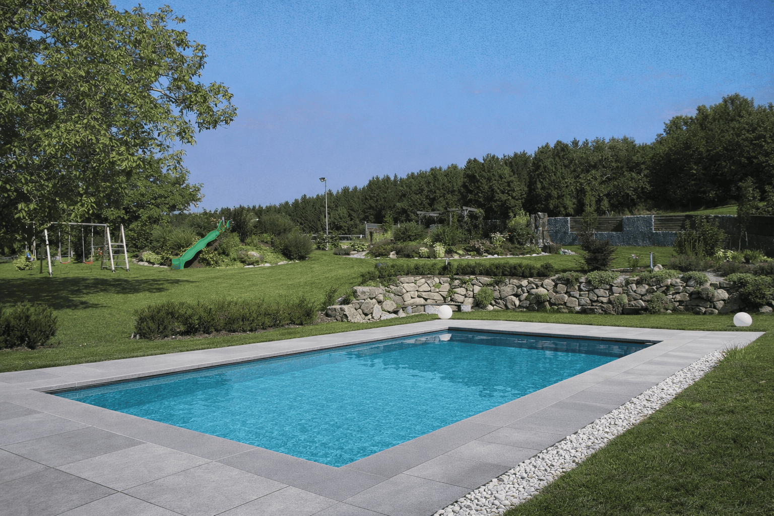 Ein weiterer Trend im Poolbau ist die Farbe RAL 7032 Kieselgrau. Mit Sonneneinstrahlung wirkt das Wasser besonders natürlich. Diese Farbgebung passt sowohl hervorragend zum klassischen Landhausstil als auch zu modernen, kubistischen Häusern. Wir freuen uns darauf, gemeinsam mit Ihnen solche stilvollen und zeitgemäßen Poolanlagen umzusetzen.