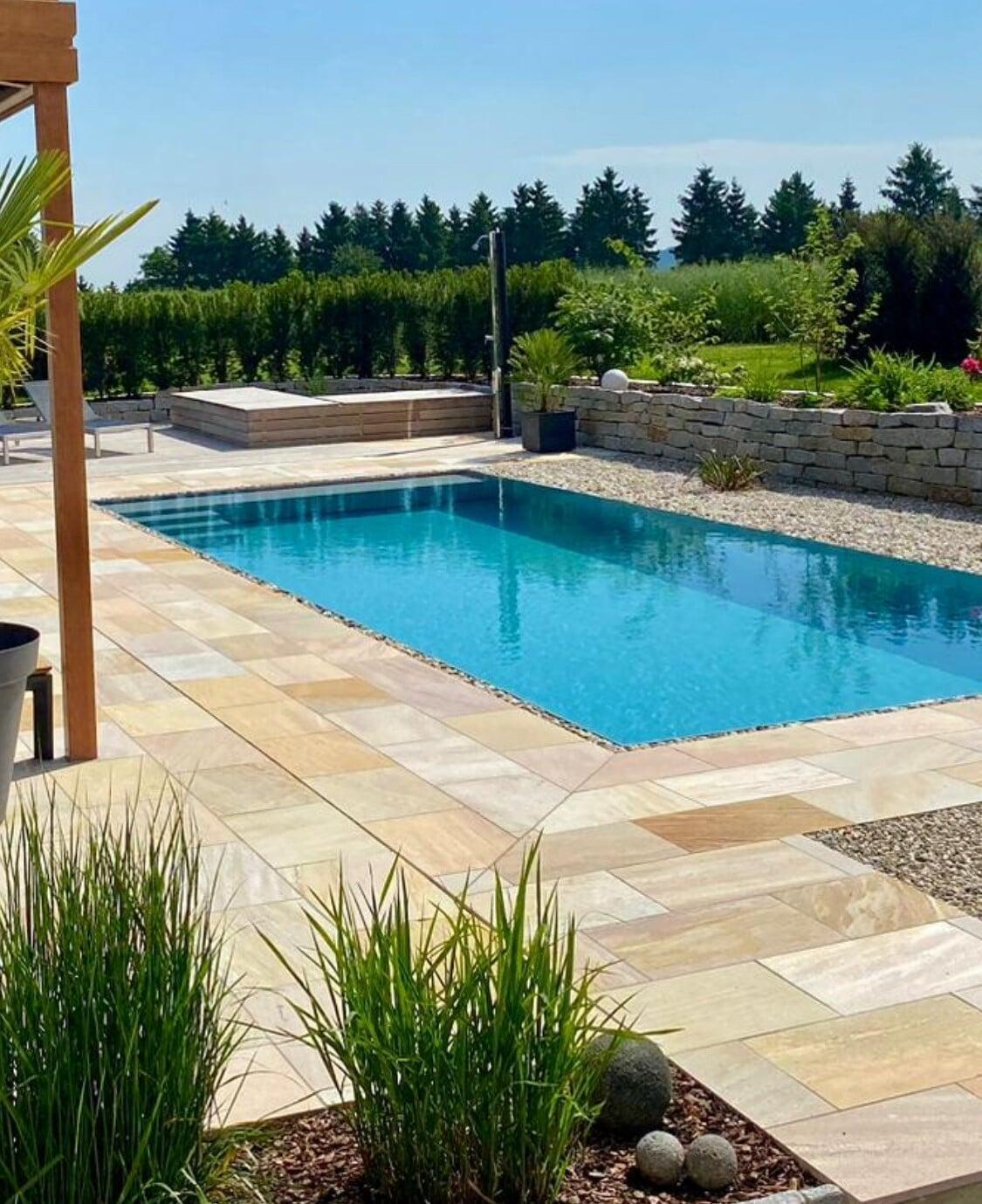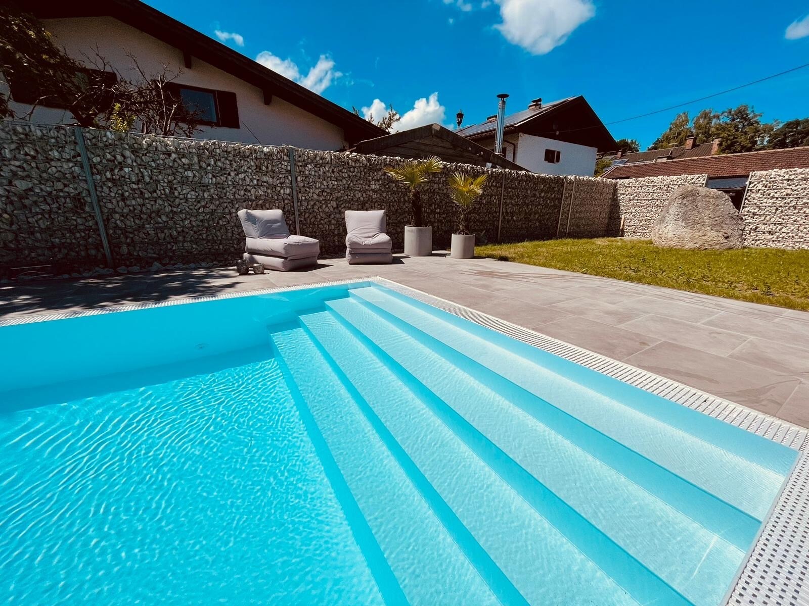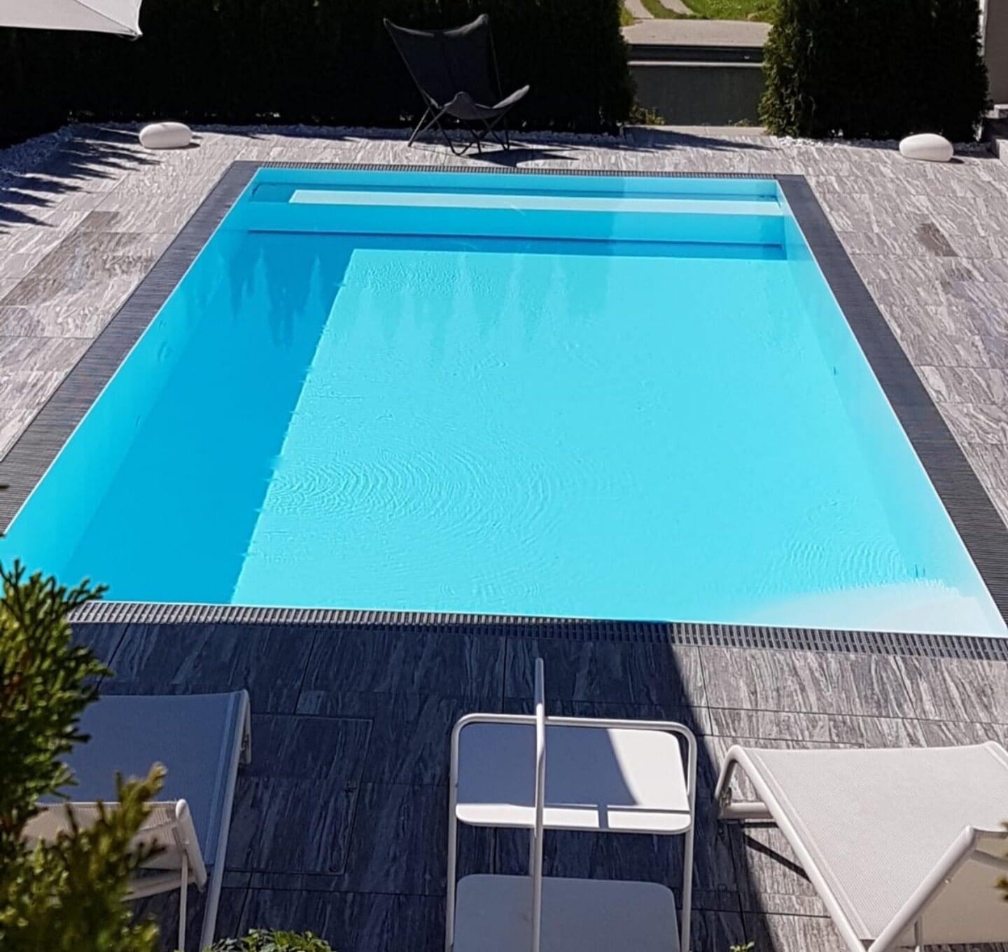 Ein weiterer Trend im Poolbau ist die Farbe RAL 7032 Kieselgrau. Mit Sonneneinstrahlung wirkt das Wasser besonders natürlich. Diese Farbgebung passt sowohl hervorragend zum klassischen Landhausstil als auch zu modernen, kubistischen Häusern. Wir freuen uns darauf, gemeinsam mit Ihnen solche stilvollen und zeitgemäßen Poolanlagen umzusetzen.