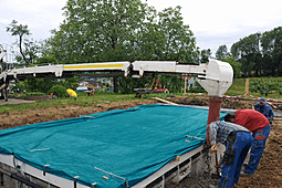 Nach der Montage kann nach etwa 24 Stunden mit der Hinterfüllung begonnen werden. Der Pool wird je nach Gegebenheiten entweder mit Isolierbeton oder mit Magerbeton hinterfüllt. Die passende Ausführung und das geeignete Material werden im Vorfeld gemeinsam abgestimmt.