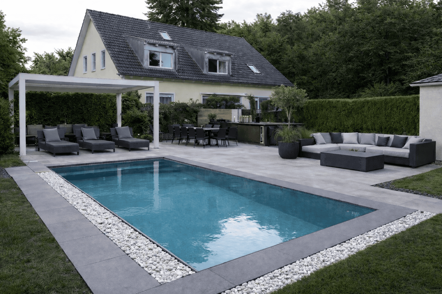 Der Pool wirkt wie ein ruhiger Spiegel und fügt sich besonders harmonisch in Garten und Architektur ein.