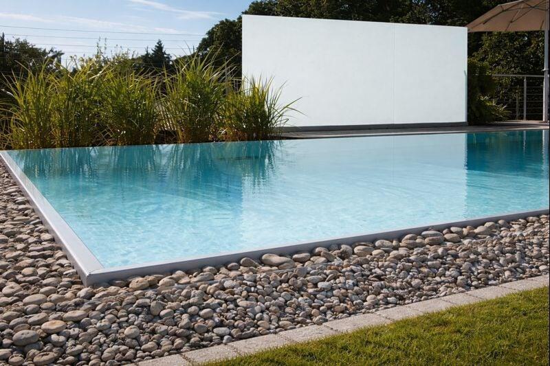 Diese Bauweise sorgt zudem für eine hochwertige und moderne Optik, da kein sichtbarer Beckenrand vorhanden ist. Die Wasserfläche bildet eine klare, elegante Linie.