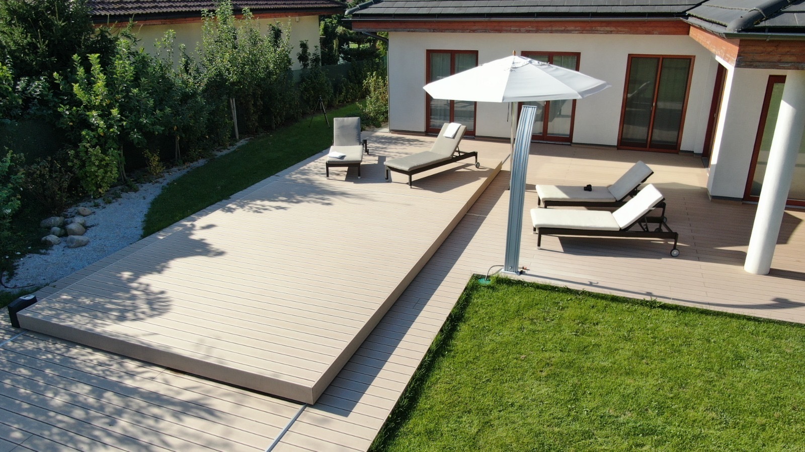 Bei der Gestaltung stehen verschiedene Oberflächen wie Holz, Kunstrasen oder Aluminium zur Auswahl, sodass sich die Abdeckung harmonisch in das Gesamtbild Ihrer Terrasse oder Ihres Gartens einfügt.